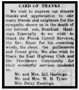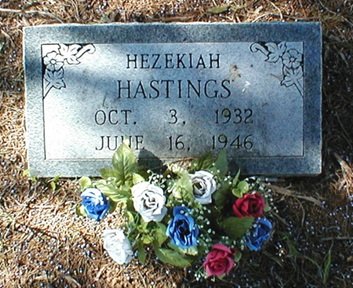 Hezekiah was born on October 3, 1932, and died on June 16, 1946. He was the son of William Bailey and Robbie Hastings. He was the brother of Donnie Hastings; Mary Lois Hastings; and Betty Hastings. In 1940, his family lived in Ash Hill, Butler county, Missouri. On June 16, 1946, Hezekiah was swimming at the Black River with some friends. Hezekiah and his friends had lunch at the Hastings residence, and later decided to go swimming. He drowned in the Black River, a short distance from the Grobe gravel pit, three miles north of Poplar Bluff, a quarter mile downstream. The water they were diving in ranged from five to fifteen-feet deep. He cried out, but the others were not able to reach him in time. His friends rushed back to town, and summoned help from the authorities. While the search was going on, the Hastings family maintained an all night vigil at the river.